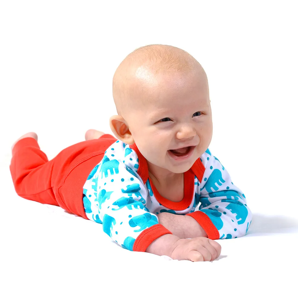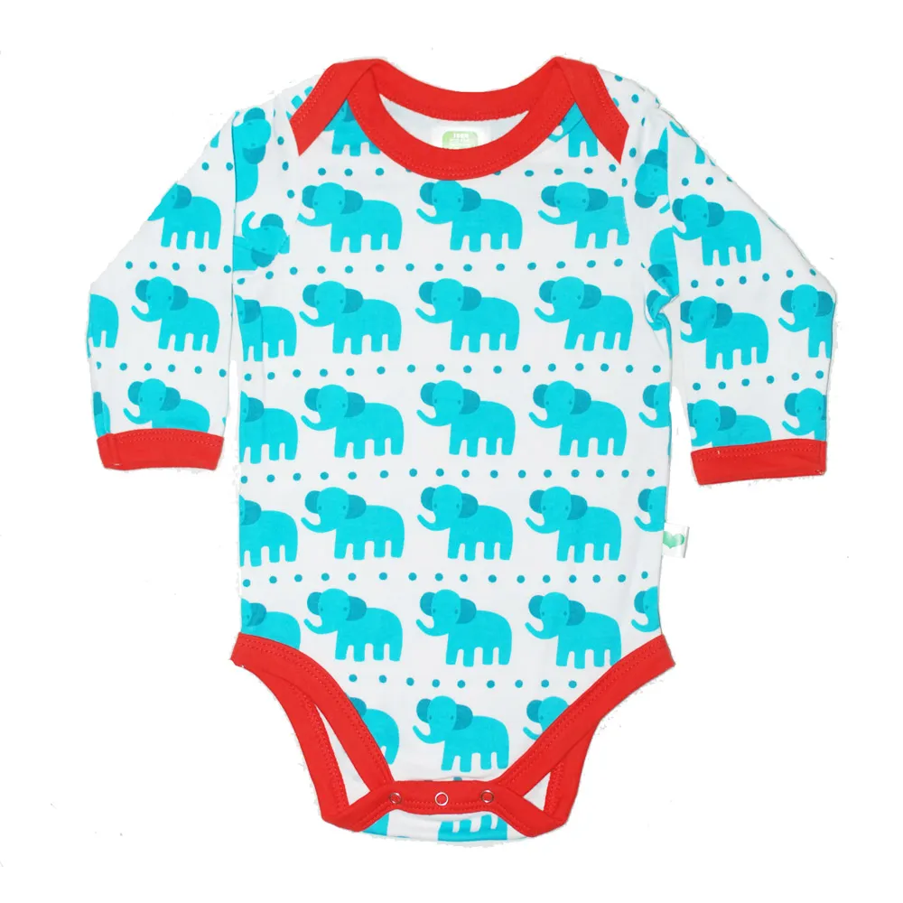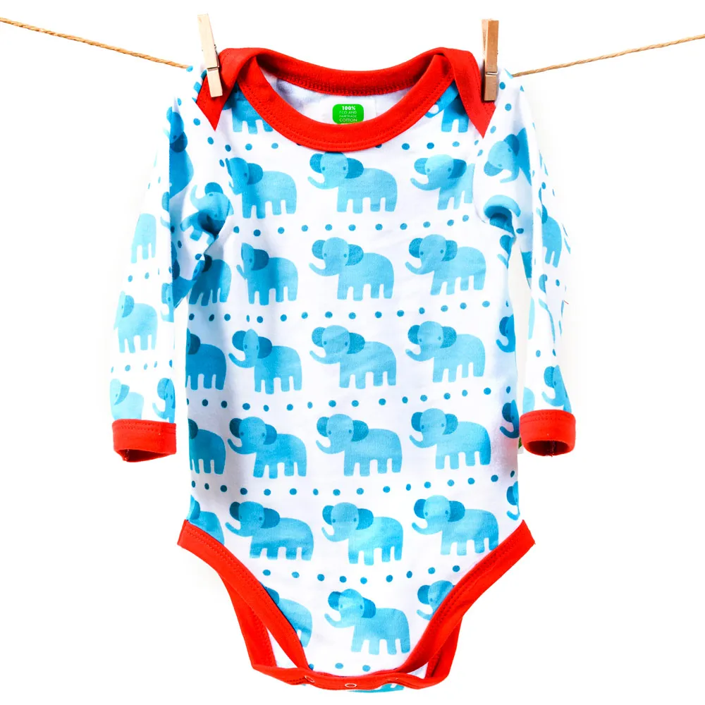 Reduziert – Langarmbody von Sture&Lisa mit kleinen blauen Elefanten. Dank dem amerikanischen Ausschnitt kann er unkompliziert über den Kopf gezogen werden. Wird im Schritt mit drei Druckknöpfen geschlossen.